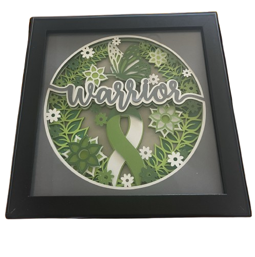 One Lyme Warrior Shadow Box (valued at $60): a handcrafted art piece that says “WARRIOR” with a green awareness ribbon, designed to be displayed on a wall or shelf as a daily reminder of strength and resilience.